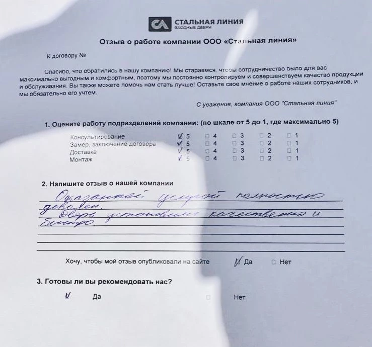 Оказанной услугой полностью доволен. Дверь установили качественно и быстро.